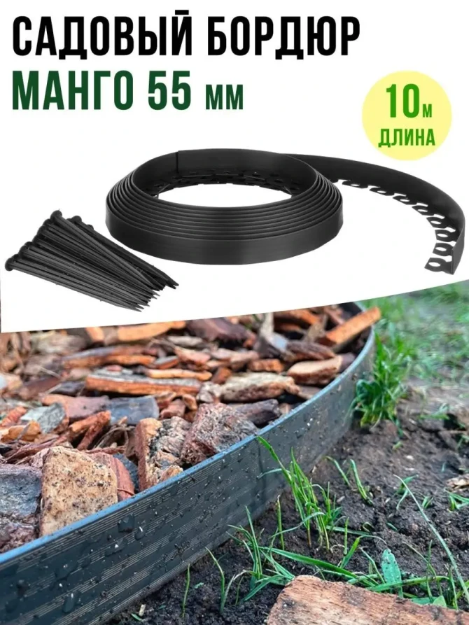 Mango Geoplastboard Flexible plastic garden curb is 10 meters long, complete with 30 mounting stakes. It is used in the landscaping of suburban areas, as a fence for beds, flower beds, for the garden and vegetable garden, ideal as a garden decor, separation of lawn and mulch, the formation of gravel paths, dry streams, alpine slides and other elements of landscape design. The product is made of high-strength polypropylene, it is not subject to corrosion and rotting. The curb easily tolerates temperature conditions from minus 50 to plus 70 degrees.
