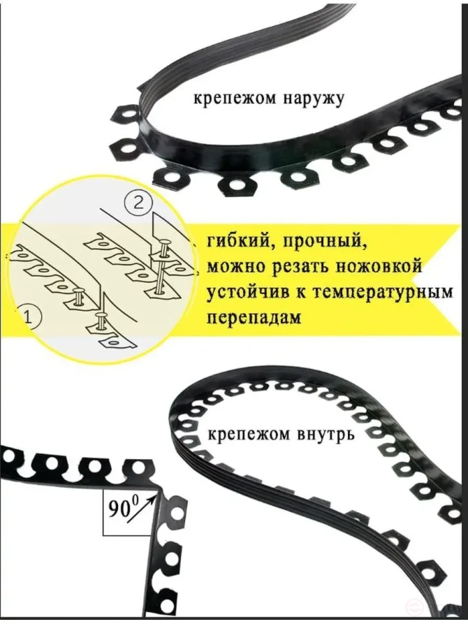 Install the garden fence by nailing it to the ground with the supplied stakes, after cutting off the required length with a hacksaw or metal scissors. Flower bed borders are an indispensable thing for those who have a cottage, a garden, a vegetable garden, with its help you will realize your design solutions where standard beds, fences and borders cannot cope. Use it both outdoors and for a greenhouse or greenhouse.