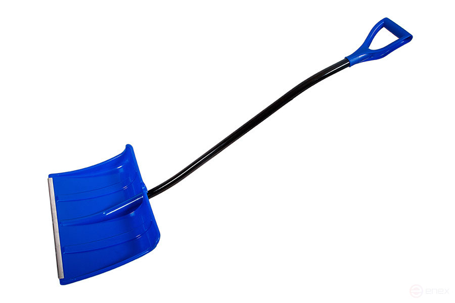 Plastic shovel "Mont Blanc" (500* 375 mm) with aluminum bar, aluminum ergonomic handle and V - handle, ultramarine color, bright saturated color. Collapsible construction.