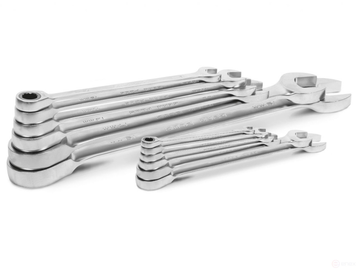 A proven set of combination keys with a ratchet of all important sizes: 8 - 9 - 10 - 11 - 12 - 13 - 14 - 15 - 16 - 17 - 18 - 19 mm. The set is in a practical transparent polypropylene box: durable packaging, stacking and convenient storage, the possibility of re-closing and reusable, with a hole for hanging on tool panels.