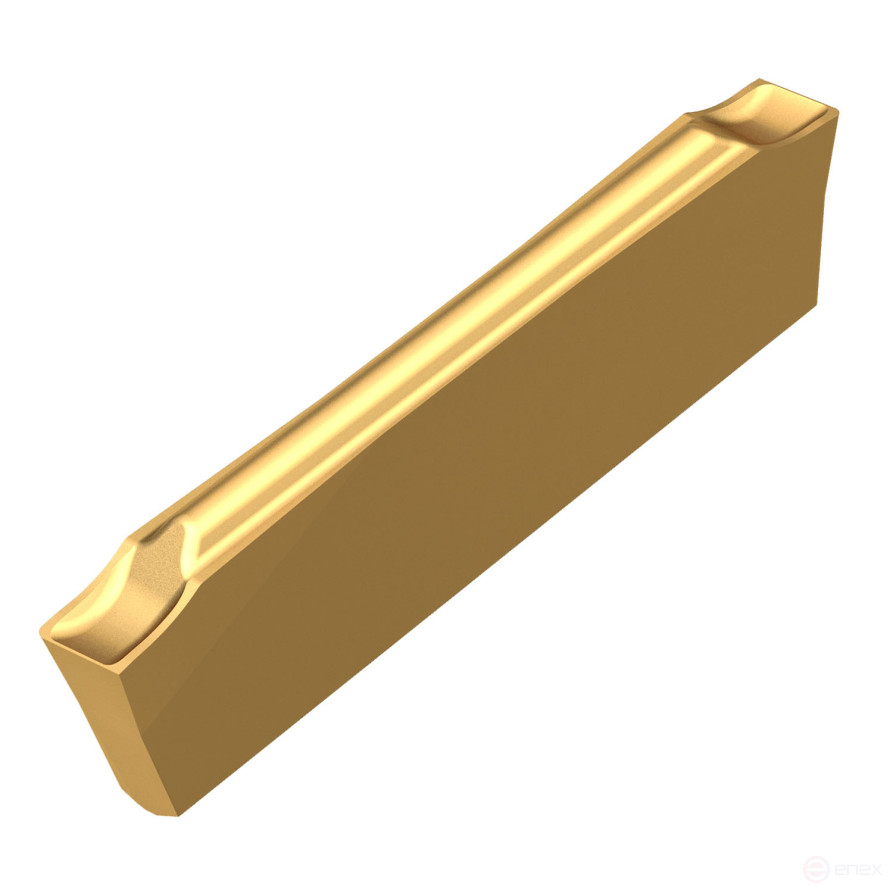 Double-sided grooving plates and segments, 19.5 mm long, 2 mm wide and 0.2 mm radius, 6° front angle for deburring on the right side, accuracy M and chip-breaking geometry M2, alloy T8330 with PVD coating, fine-grained substrate WC-Co, application according to ISO P25-P40 and M20-M35 for processing workpieces made of structural steels and stainless steels, in combination with GF..(RL) 02 and XLCCN 0220 holders