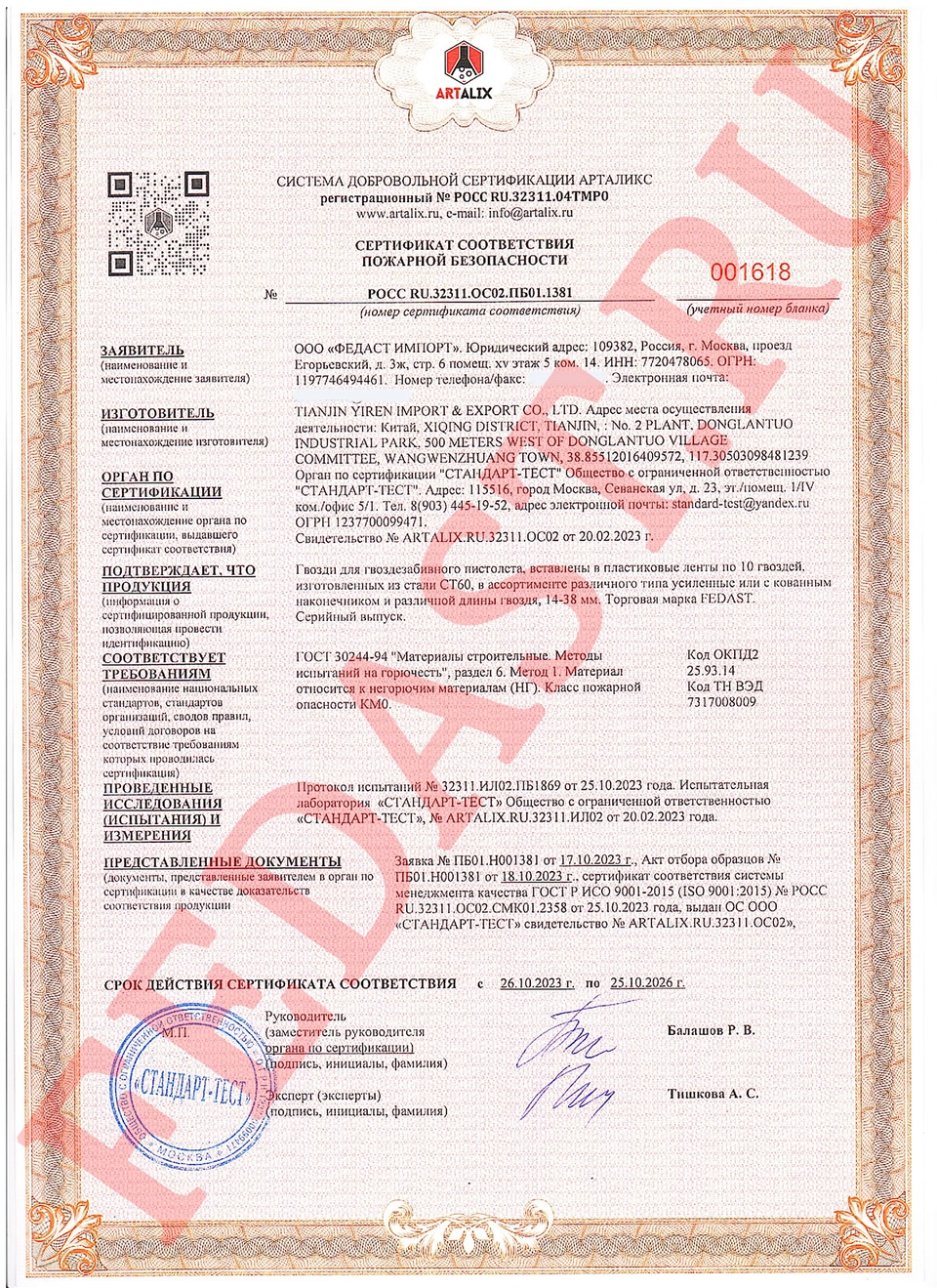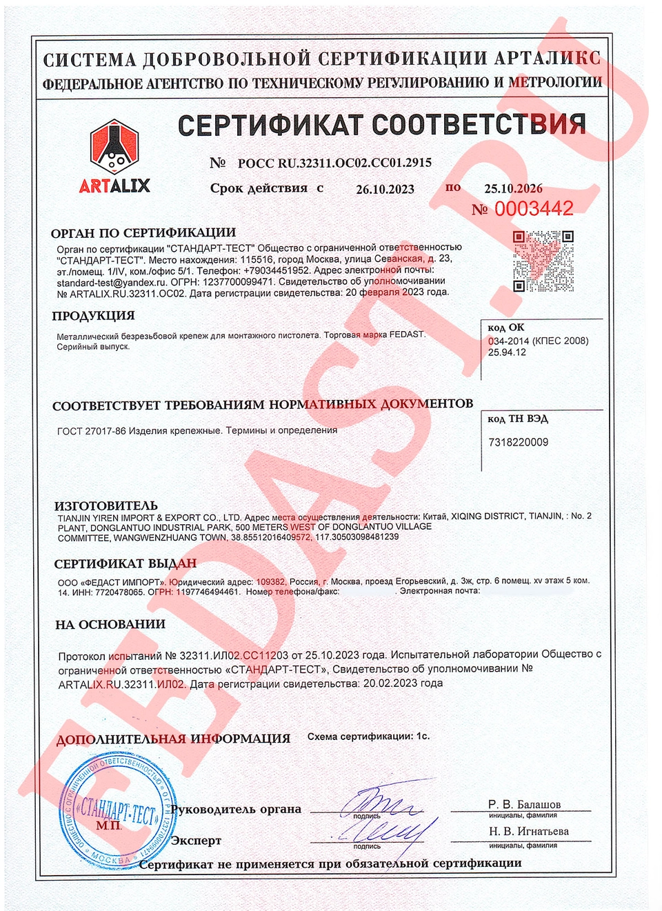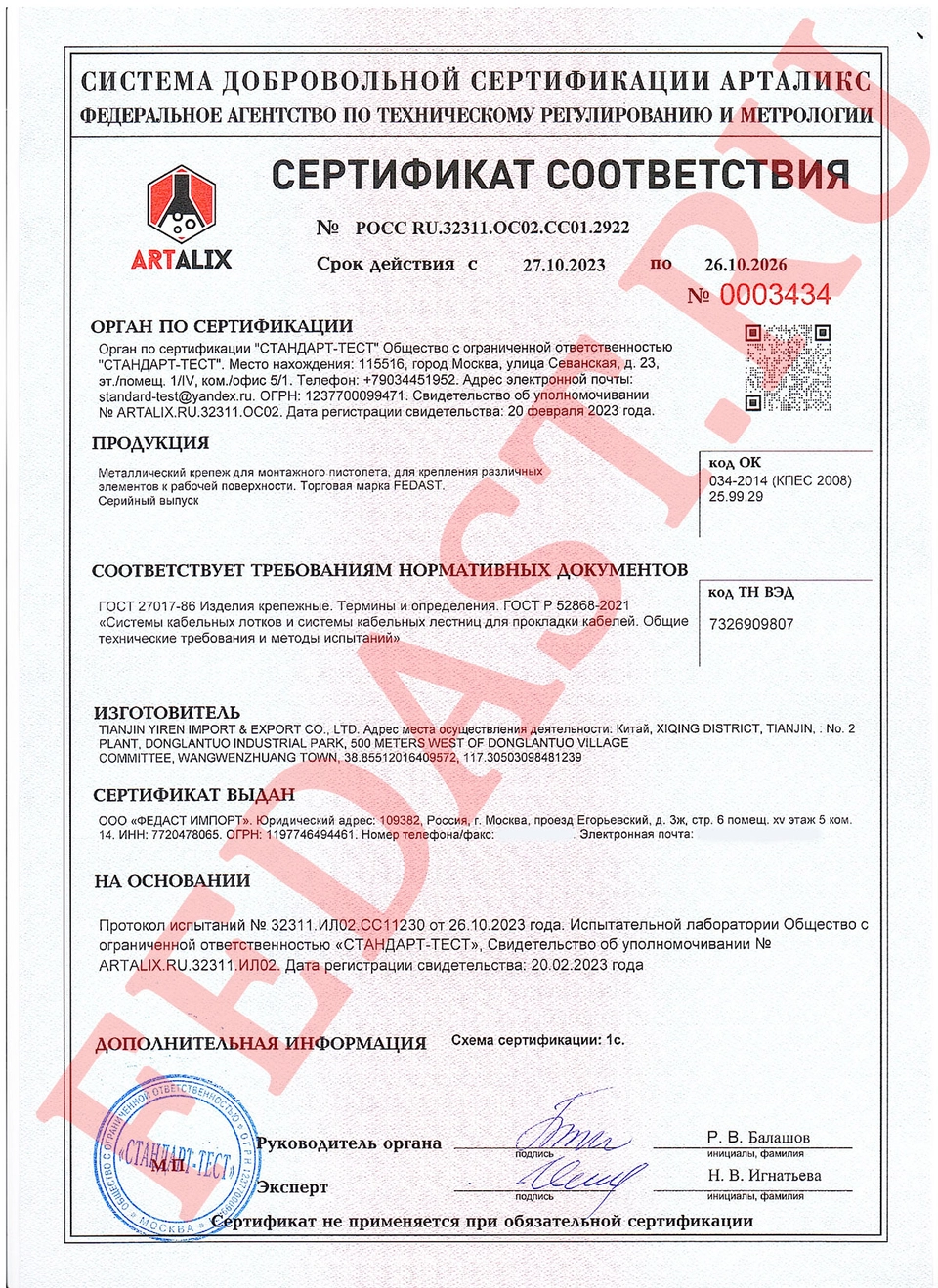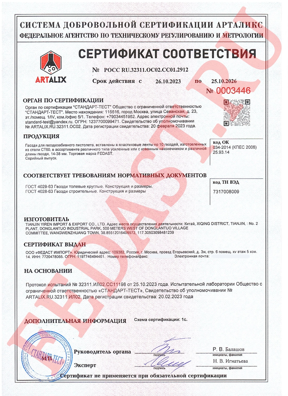 включает в себя сертификаты на различные группы инструментов, производимым компанией Fedast