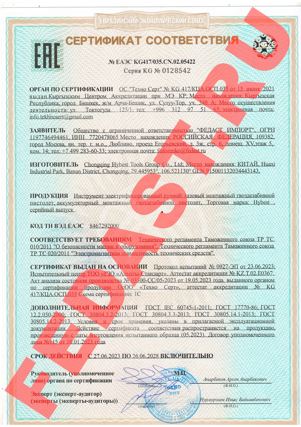 Сертификат соответствия № ЕАЭС KG417/035.CN.02.05404