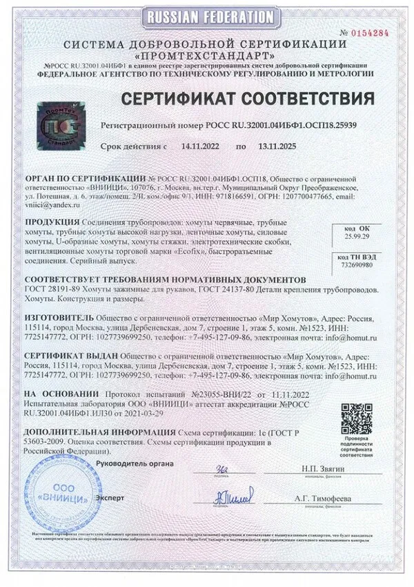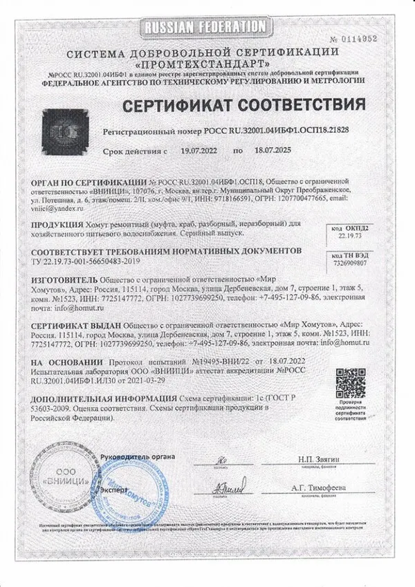 включает в себя сертификаты на различные группы инструментов, производимым компанией Мир хомутов