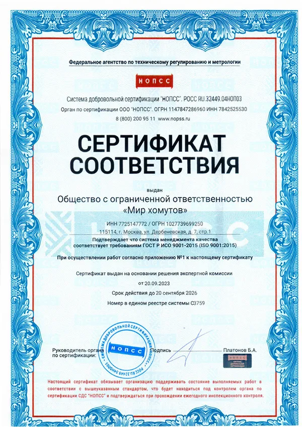 Сертификат качества ISO 9001:2015 ООО "Мир хомутов"