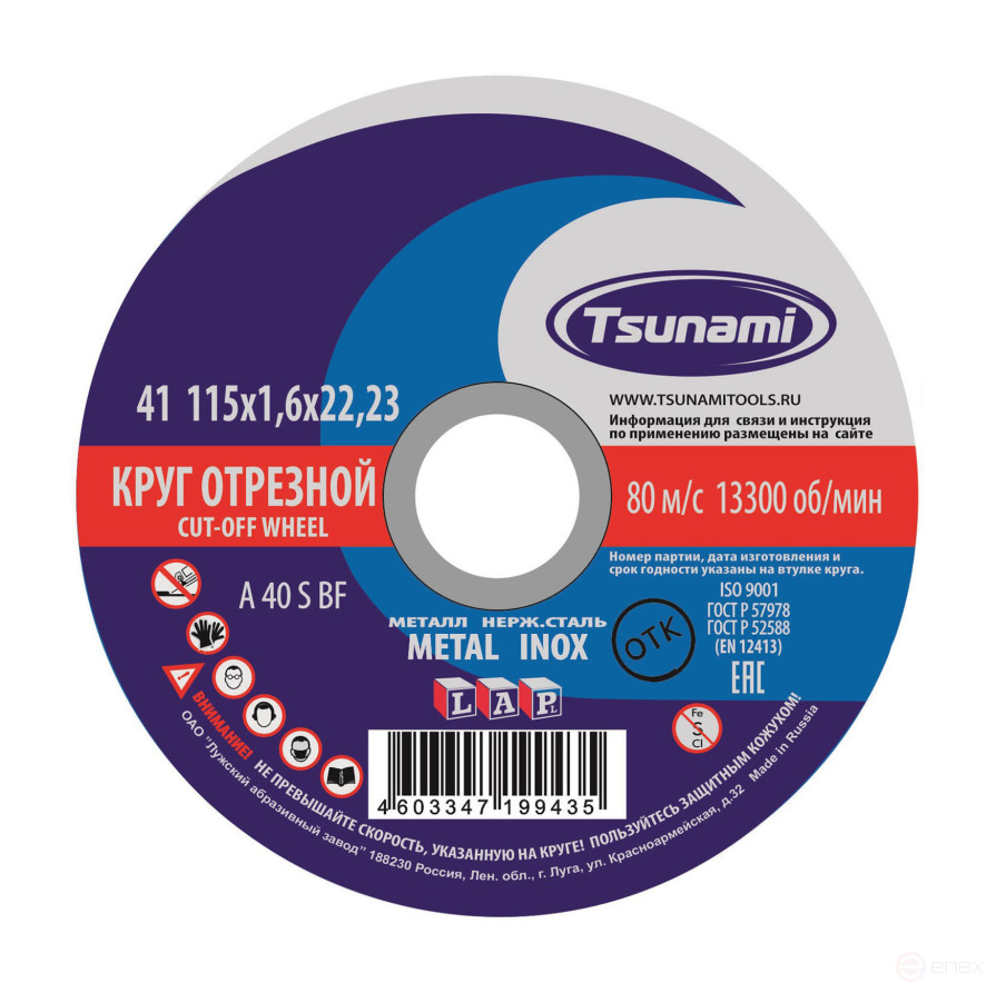 115х1,6х22 A 40 S BF Lкруг отрезной по металлу/нержавейке TSUNAMI