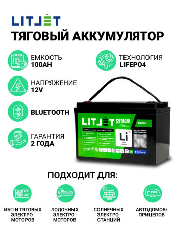 Литий железо-фосфатный аккумулятор (LiFePO4) тяговый LITJET GREEN имеет напряжение 12 вольт, предназначен для работы в глубоких циклах разряда и заряда. Не может быть использован для запуска ДВС. Относится к тяговым аккумуляторам.