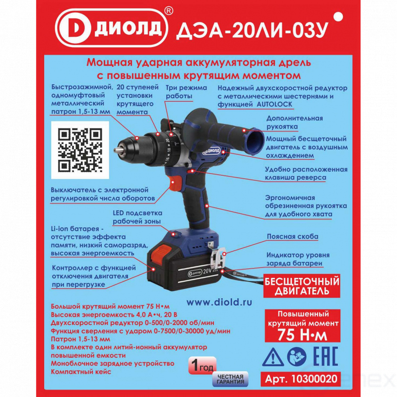 Аккумуляторная дрель-шуруповерт Диолд ДЭА-20ЛИ-03 У