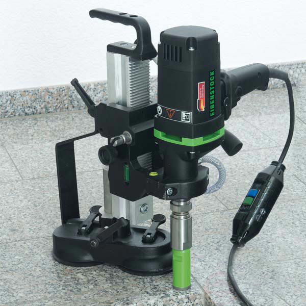 Алмазная дрель Eibenstock END 1550 P сверлит отверстия в строительных материалах, таких как: натуральный камень, керамическая плитка, керамика, фарфор, каменная керамика, стекло, железобетон. Мощность двигателя 1,5 кВт. Максимальный диаметр бурения - 68 мм. При бурении возможно охлаждение алмазной коронки водой. Подача воды в место бурения охлаждает коронку, что положительно сказывается на ее ресурсе, а также уменьшает образование пыли. Также дрель можно использовать в комплекте со станиной для стационарного применения при бурении большими диаметрами коронок.