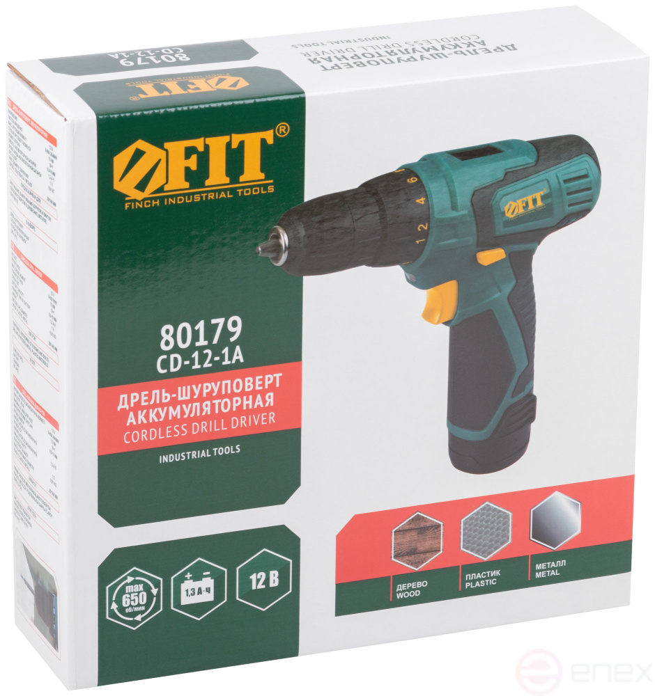 Дрель-шуруповерт акк. 12,0 В; 0-650 об/мин; 15,0 Нм; 1 (Li-Ion) 1,3 Ач; 1 ч.; рез. накл.; коробка