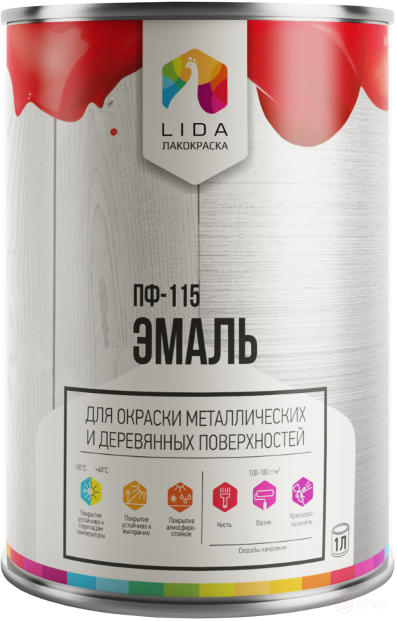 Область применения: Эмаль ПФ-115 "LIDA" предназначена для окраски металлических, деревянных и других поверхностей, эксплуатируемых внутри помещений и в атмосферных условиях. Эмаль не является фасадной.