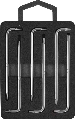 Согнутый под углом 90° стержень с рабочими профилями одного размера на обоих концах, сочетает в себе относительное удобство использования с возможностью приложения значительных рабочих нагрузок, когда в качестве ручки используется длинная часть и работу в труднодоступных местах, когда в качестве воротка используется короткая. Комплект угловых шестигранников "H09MT06S" изготовлен из стали S2, имеет матовое хромоникелевое покрытие.