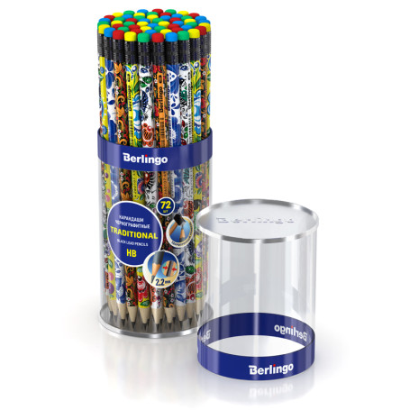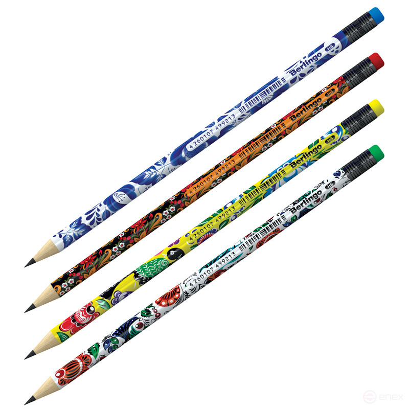 Чернографитный карандаш Berlingo "Traditional" из липы, с ластиком, с заточкой. Яркие русские узоры ассорти. Специально обработанная древесина для идеальной заточки. Подходит для черчения и рисования. Упаковка - прозрачная, разъемная ПВХ-тубу с возможностью использования в качестве подставки.