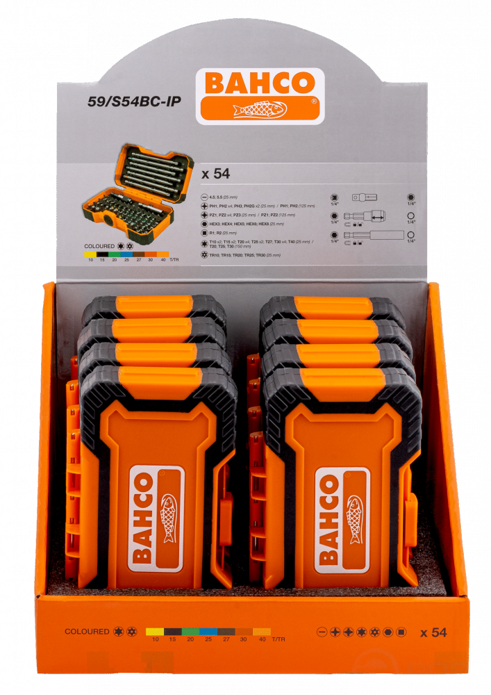 - Дисплей с наборами бит под винты со шлицем, Phillips, Pozidriv, шестигранные , Robertson и с цветовой кодировкой TORX®,TORX® Tamper, 54 шт, 8 наборов