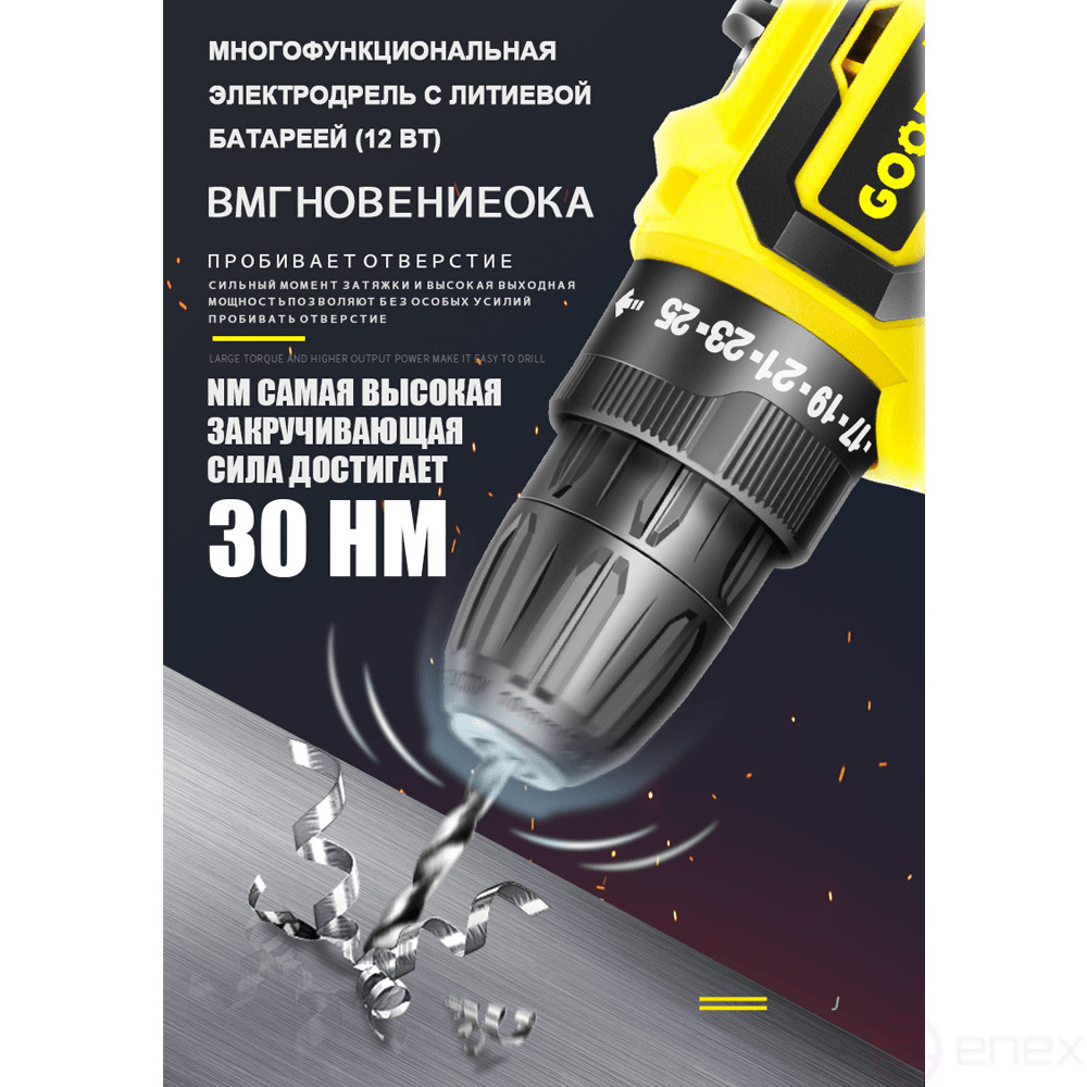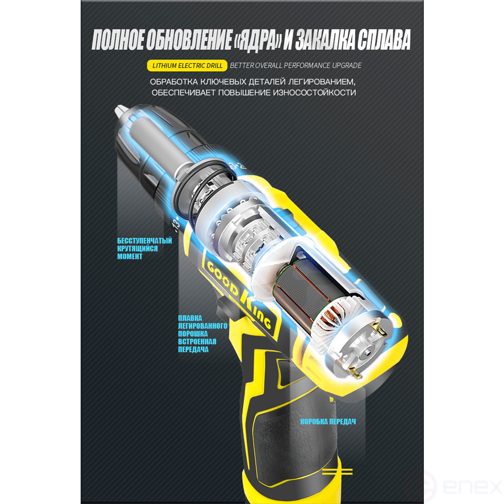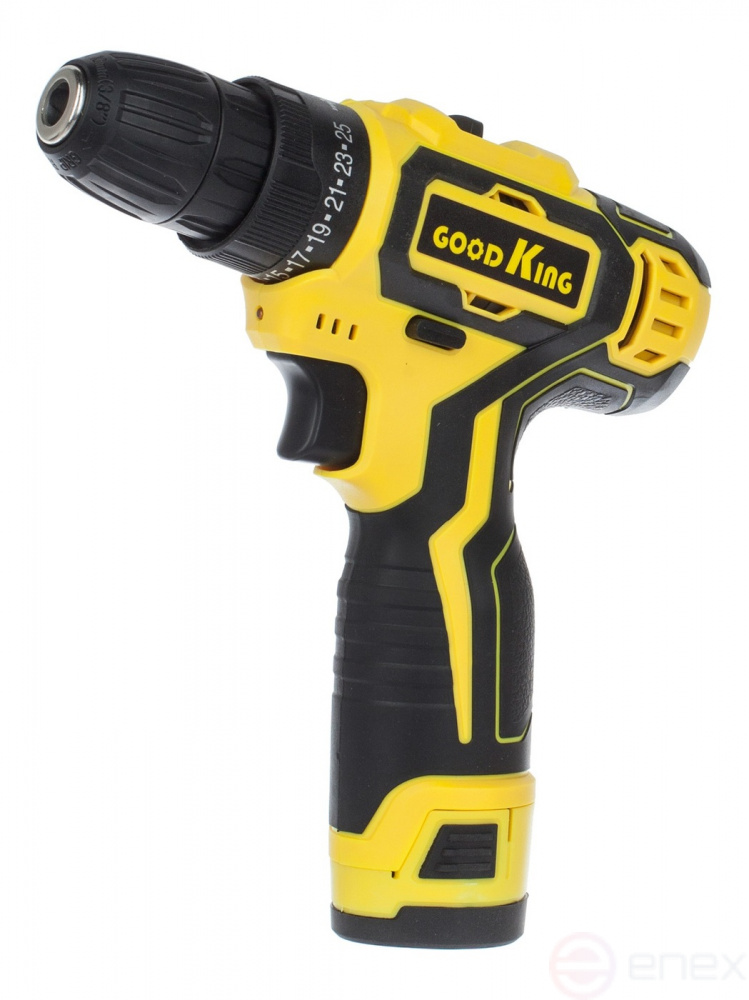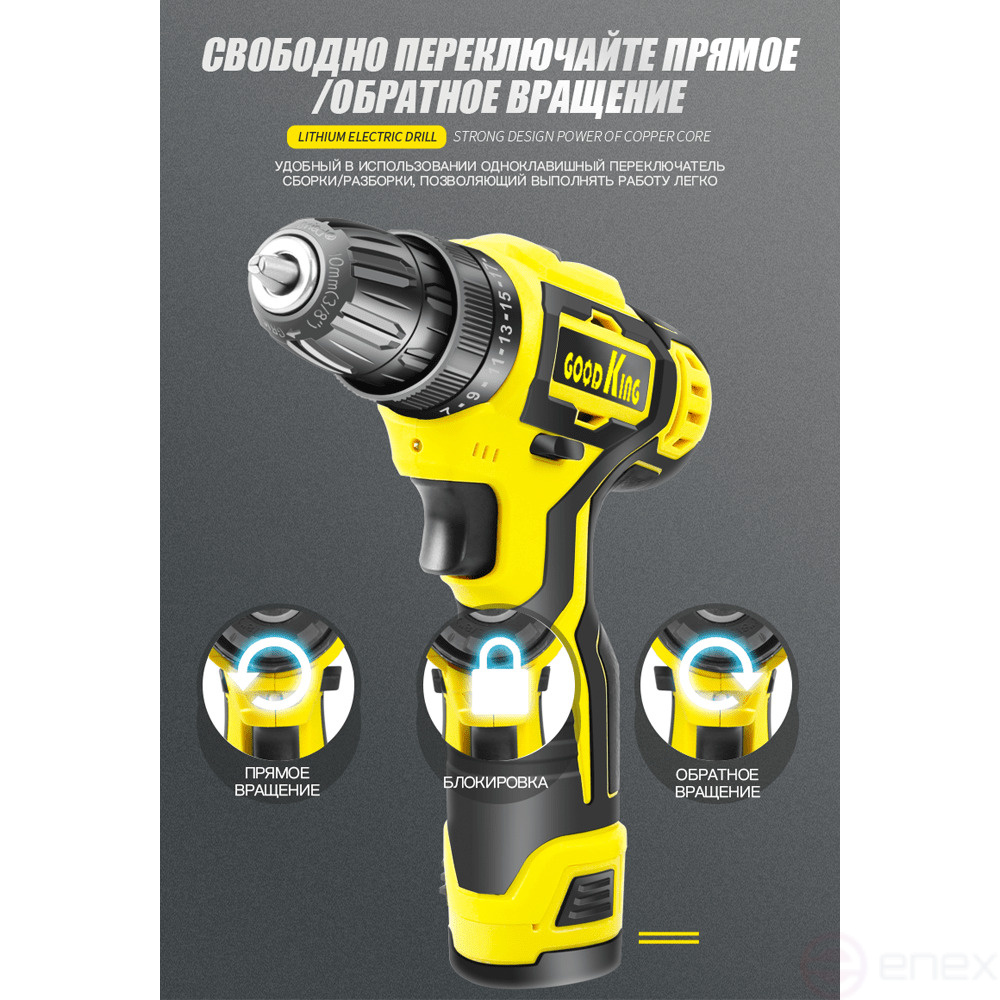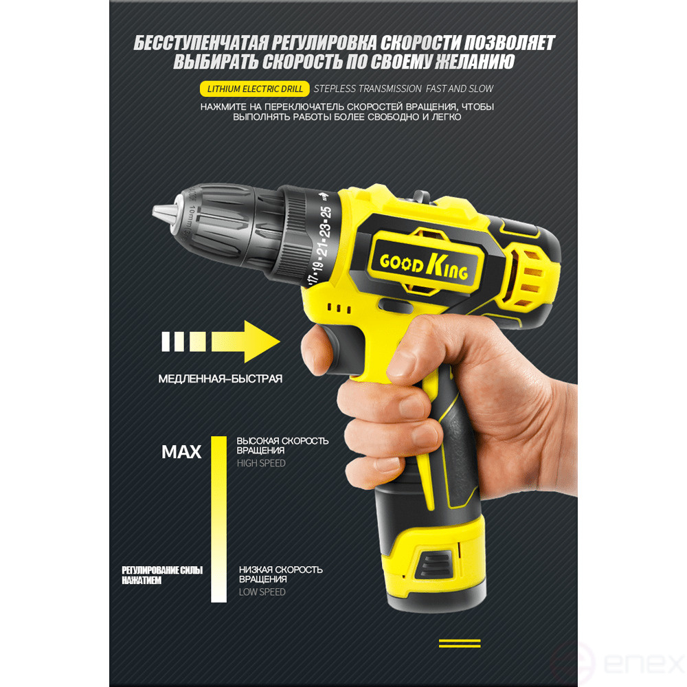 Аккумуляторная дрель-шуруповерт GOODKING предназначена для сверления отверстий в различных материалах. Инструмент комплектуется мощным 2-скоростным редуктором.