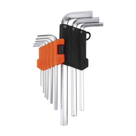 Набор Г-образных шестигранных удлиненных ключей 1,5-10 мм с держателем. Ключи изготовлены из CRV стали.