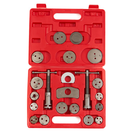 Набор инструментов для обслуживания тормозных цилиндров, 21 предмет. Данное приспособление предназначено для выжимания тормозных цилиндров, что значительно упрощает установку тормозных колодок. Подходит для большинства автомобилей, в том числе: Mercedes, BMW, Volkswagen, GM, Audi, Ford, Honda, Subaru, Mazda, Nissan, Mitsubishi, Toyota, Land Rover.