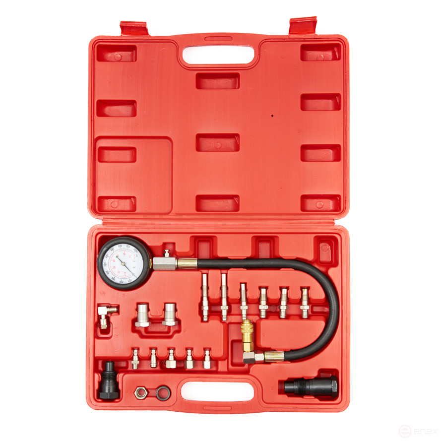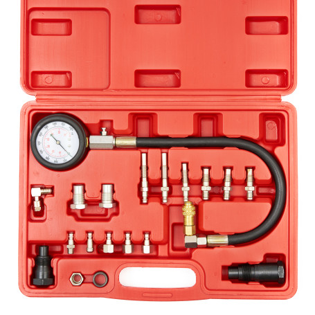 Компрессометр для дизельных ДВС с быстросъемными адаптерами, 0-1000 PSI (0-70 бар) используется во время сезонного техосмотра автомобиля или во время ремонта по причине возникновения неполадок в системе подачи топлива (поршень, цилиндр). Благодаря большому количеству адаптеров, входящих в комплект, проверку давления рабочей жидкости можно осуществлять в большинстве существующих автомобилей, оснащенных дизельным двигателем.