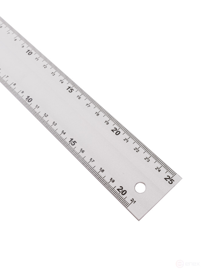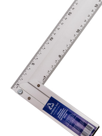 Угольник изготовлен из алюминиевого анодированного профиля – алюминиевая анодированная линейка сечением 39х2,7 мм с односторонней разметкой в мм, и алюминиевая анодированная ручка, сечением 34х12 мм. Точность: +/- 0,0285 ° = 0,5 мм/м.