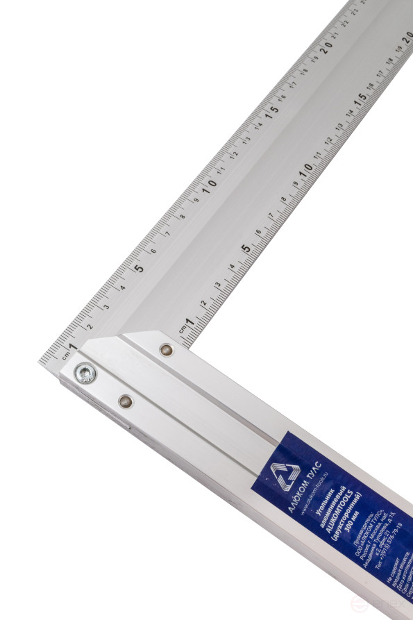 Угольник изготовлен из алюминиевого анодированного профиля – алюминиевая анодированная линейка сечением 39х2,7 мм с односторонней разметкой в мм, и алюминиевая анодированная ручка, сечением 34х12 мм. Точность: +/- 0,0285 ° = 0,5 мм/м.