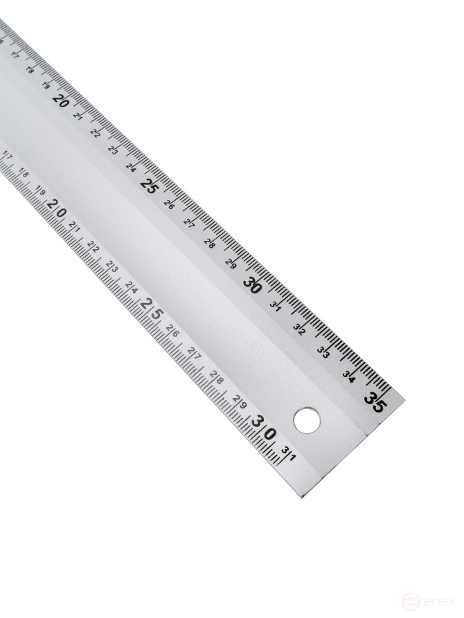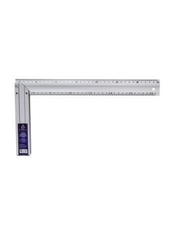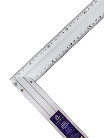 Угольник изготовлен из алюминиевого анодированного профиля – алюминиевая анодированная линейка сечением 39х2,7 мм с односторонней разметкой в мм, и алюминиевая анодированная ручка, сечением 34х12 мм. Точность: +/- 0,0285 ° = 0,5 мм/м.