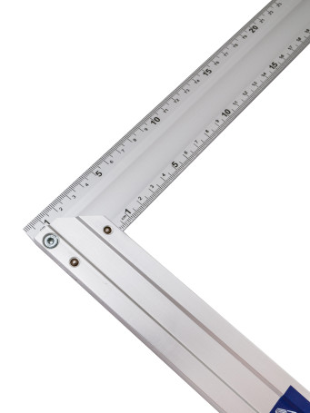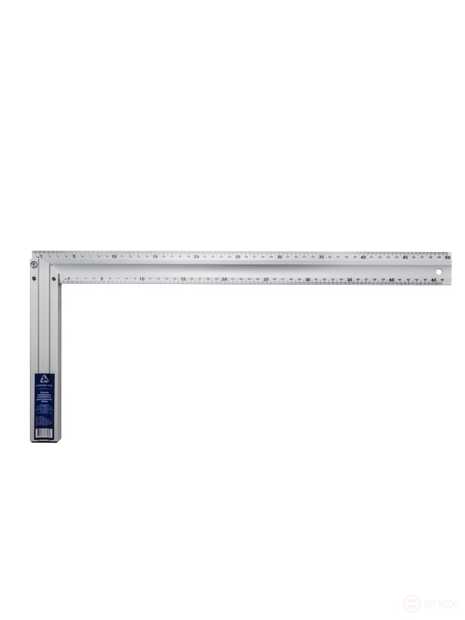 Угольник изготовлен из алюминиевого анодированного профиля – алюминиевая анодированная линейка сечением 39х2,7 мм с односторонней разметкой в мм, и алюминиевая анодированная ручка, сечением 34х12 мм. Точность: +/- 0,0285 ° = 0,5 мм/м.